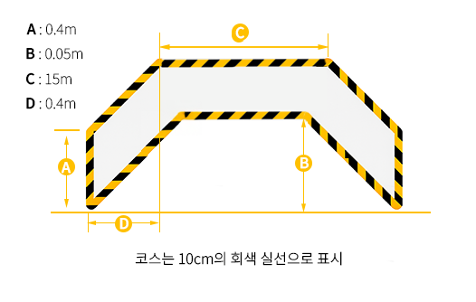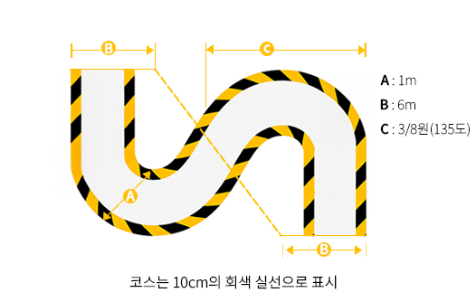 - 시험방법 : 화살표 방향으로 진입하여 진로를 변경하면서 검지선을 접촉하거나, 발이 땅에 닿거나, 라바콘을 접촉하지 않고 통과
