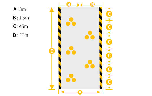 - 양쪽 끝은 10센티미터 너비의 황색 실선으로 표시